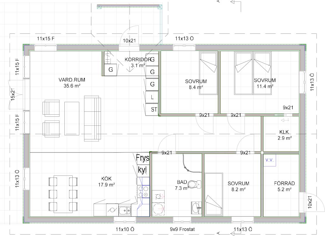 Vättlandsvillan tegen är en året runt villa på en bygg yta på 122 kvadrat samt en bo yta på 98 kvadrat. Ytterväggar har en dubbelfas panel. Alla väggar på insidan av huset har gips på trä skiva av modell osb så man lätt kan skruva upp saker på väggar.